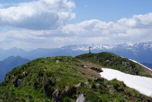 Itinerario: Da Trento si prende la strada per Riva del Garda, proseguendo poi verso la Val di Ledro. Arrivati a Molina di Ledro, si continua lungo la strada provinciale che costeggia il Lago di Ledro. Dopo circa 4 km si giunge a un bivio: sulla destra si trovano le indicazioni per Mezzolago e per il parcheggio del paese. Dal parcheggio si imbocca la strada principale del borgo, seguendo le indicazioni per Dromaè, Cima d’Oro e il sentiero botanico. Dopo circa 15–20 minuti si raggiunge un bivio con il sentiero SAT 453, segnalato da un cartello bianco-azzurro “Camminamento Austroungarico 1915–1918 – Cima d’Oro”. Si prosegue su strada asfaltata e, dopo altri 5–10 minuti, si incontra un secondo bivio con un cartello simile. Da qui si continua su strada sterrata. Dopo altri 5–10 minuti si arriva a un terzo bivio con indicazioni per il sentiero botanico Dromaè e il Camminamento Austroungarico. (È possibile continuare sulla strada sterrata.) Il sentiero diventa boschivo, ben tracciato, e incrocia nuovamente la strada sterrata risalendo le Coste di Salò. Si giunge al bivio denominato “Sella” (1425 m s.l.m.), dove iniziano a comparire postazioni e trincee risalenti alla Prima Guerra Mondiale. Da alcune di queste è possibile ammirare splendide vedute sul Lago di Ledro e sulle cime circostanti. Dopo circa 1h30 di cammino dal bivio Sella, si attraversa una breve postazione (circa 10 metri) situata sotto l’antecima di Cima d’Oro. Usciti dalla postazione, si prosegue per 5 minuti lungo una trincea che conduce alla croce di vetta, dove si trovano una postazione, due targhe commemorative dei caduti e una magnifica vista sulla valle e sulle catene montuose. La vera cima di Cima d’Oro si trova poco distante dalla croce: circa 10 minuti di salita lungo un pendio erboso, accanto ai resti di una trincea. Dalla vetta si gode di un panorama a 360° sul Gruppo del Brenta, Gruppo dell’Adamello, Tre Cime del Bondone, Monte Stivo, catena del Baldo, Lago di Garda, Lago di Ledro e i paesi lungo il lago.