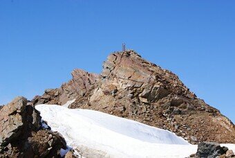 Dal rifugio si vede chiaramente la dorsale che conduce alla cima. In circa 20 minuti si raggiunge la vetta: prima si incontra la croce dedicata ai caduti della montagna, poi, poco sopra, si arriva ai 3645 m del Monte Vioz. Il panorama dalla cima è straordinario: Palon de la Mare, il massiccio del Cevedale, Punta San Matteo, il Lago Careser, la Val di Pejo, le Dolomiti, la Presanella e, sotto i piedi, il ghiacciaio che scende dal monte.